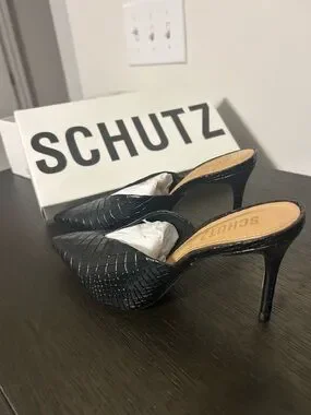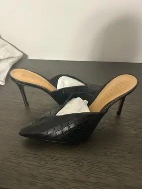 Black croc-embossed leather mules with a pointed toe. Slim stiletto 3.75in heel.