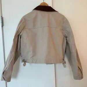 Slightly cropped workwear jacket with a contrasting brown corduroy collar. Front zip closure a boxy silhouette. 100% cotton canvas. Worn once, like new.