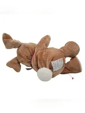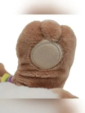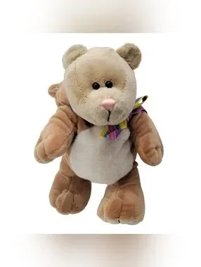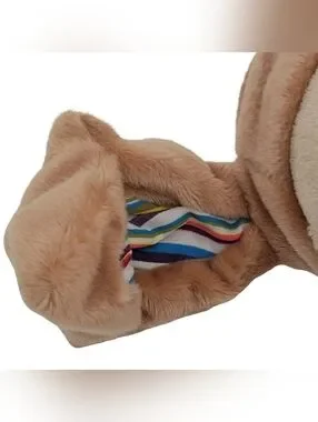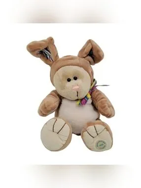 • The collectible plush features a brown bear wearing a bunny suit w/a hood that pulls back & a multi-colored striped bow tie.