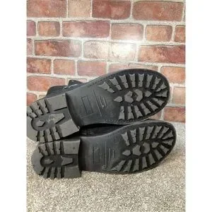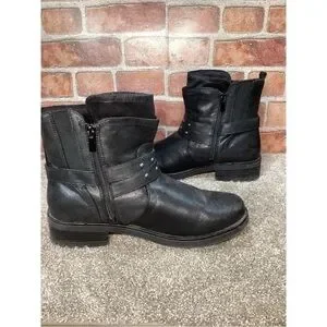 Edgy ankle boots with studded strap and buckle detail. Smooth black upper with low stacked heel. Easy slip-on style with inner zipper. Versatile for casual or dressed-up looks.