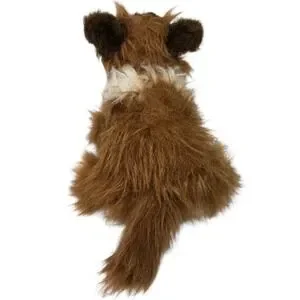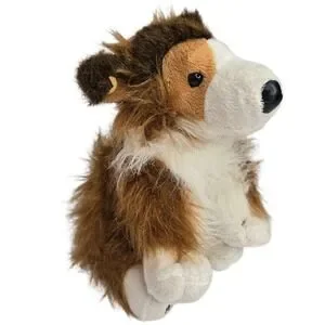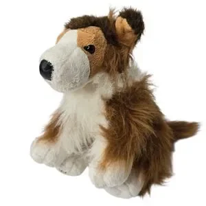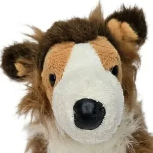 • Brown and white collie design with soft shaggy fur, brown eyes, and black nose