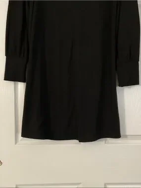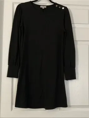 Simple black shift dress from LOFT. Long sleeves with cuff detail. Decorative shoulder buttons add a touch of shine. Smooth, streamlined silhouette. Versatile for day or night wear.