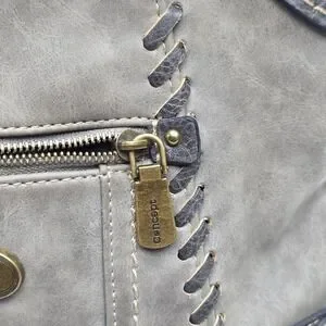 Stylish crossbody handbag from Concept, perfect for everyday use. Featuring a gray faux leather exterior with unique whipstitch detailing and dark gray accents, this bag offers both fashion and function. It includes multiple pockets, both inside and out, to keep your belongings organized and easily accessible. The adjustable shoulder strap provides a comfortable fit for all-day wear. Ideal for casual outings, shopping trips, or weekend adventures, this bag combines practicality with a touch of rustic charm.