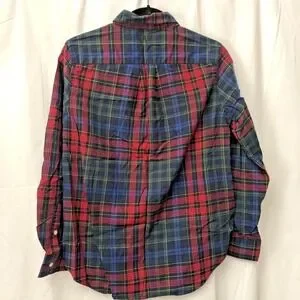 The Ralph Lauren Boys Madras Plaid Long Sleeve Button-Up in size L/G (14-16) is a classic and versatile piece for young boys. Made from 100% cotton with a comfortable regular fit, this collared shirt features a traditional button-up closure and a logo accent. The multicolor plaid design in red, blue, and green adds a pop of color to any outfit, making it perfect for various occasions such as school, walking, and everyday wear. Machine washable for easy care, this timeless basic is a must-have in any boy's wardrobe.