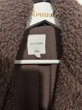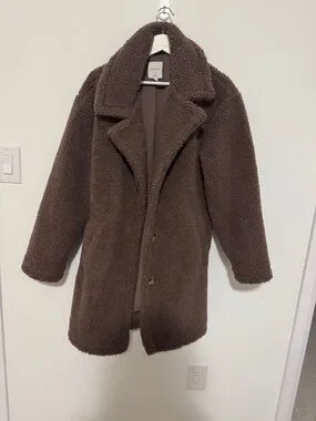 Plush teddy exterior in neutral taupe. Soft textured finish with open front. Cozy, casual layering piece for everyday wear. Oversized.