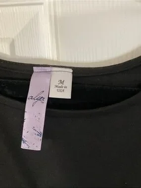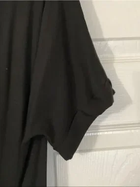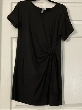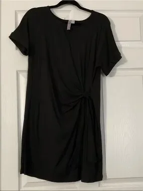Black short-sleeve mini dress with a side knot detail. Soft drape and relaxed silhouette. Crew neckline and simple, versatile style.