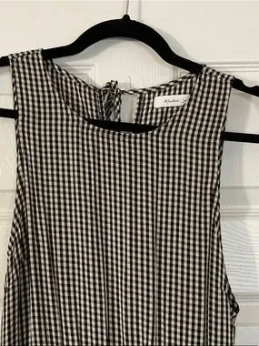 Sleeveless mini dress with a classic gingham print. Tiered skirt adds playful volume. Round neckline for a simple silhouette. Lightweight fabric suitable for everyday wear.
