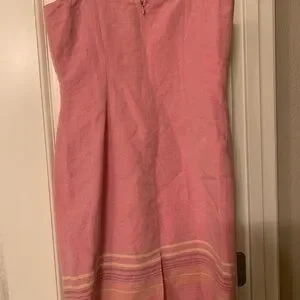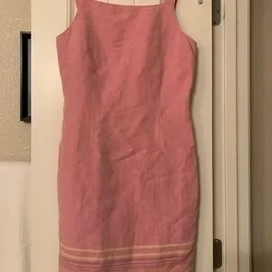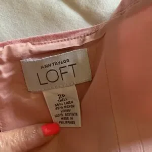 This Ann Taylor LOFT Women’s Pink Dress is a stylish and elegant choice for various occasions such as weddings, parties, and formal events. The dress features a square neckline, a knee-length hem, and a fitted sheath style. The intricate detailing at the hem adds a unique touch to the overall design. Made from a comfortable linen blend fabric with accents like a zipper closure and strappy sleeves, this dress is perfect for the summer and spring seasons. The pink color make it a feminine and charming option for petite women looking for a chic and sophisticated attire.