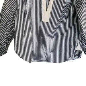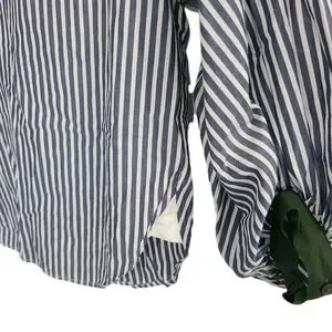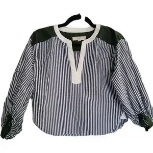 The Loft Colorblock Poplin Petite Blouse Top in Women's size XSP features a stylish colorblock design in green and white. This blouse has a V-neckline, 3/4 balloon sleeves, and a pullover closure for easy wear. Perfect for travel, casual outings, or workwear, this lightweight blouse by Loft is a versatile addition to any petite woman's wardrobe. Made in India, this blouse offers a regular fit and is machine washable for easy care.