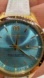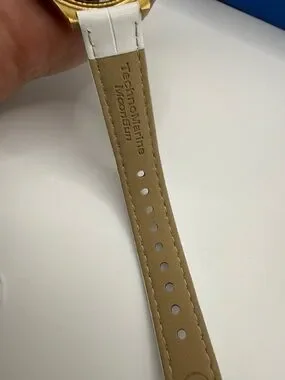 Elegant Technomarine men’s watch. Turquoise sunray dial with gold-tone case and hands. Date window at 3 o’clock. White leather-style strap for a refined look. Quartz movement and water resistant.