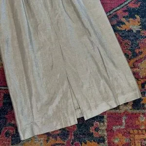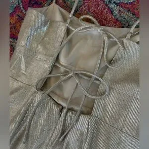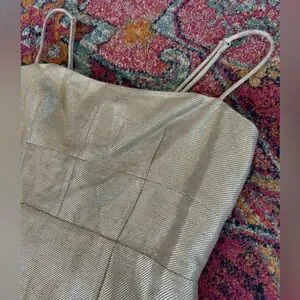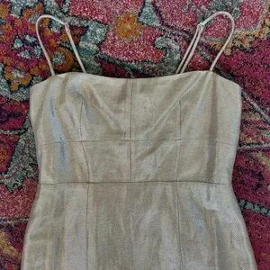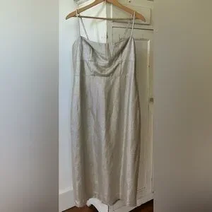 NWT J. Crew | Women’s champagne shimmer midi sheath dress. Adjustable spaghetti straps, double back ties, back zipper/clasp closure. Back slit, fully lined. Dry clean only, 51% viscose, 40% linen, 9% metallized fiber. Women’s size 10