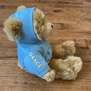 Soft fluffy teddy bear in light brown tan with blue Dance Team zip up hoody sweatshirt.