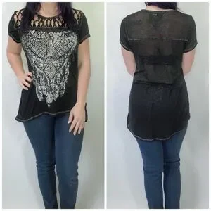 Maurices Semi-Sheer Black Dreamcatcher Graphic High Low Short Sleeve Top