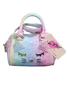 Betsey Johnson pastel multicolor cat satchel. Playful cat-face hardware and structured silhouette. Detachable strap for versatile carry. Soft rainbow hues add whimsical flair to outfits.