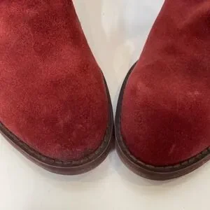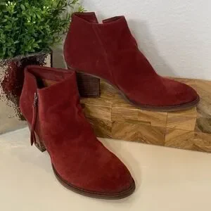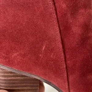 Tags: boot, bootie, ankle boot, side zip, suede, stacked heel, dark red, fall, winter, spring, office, work, business casual, school, gno, Cottagecore, normcore