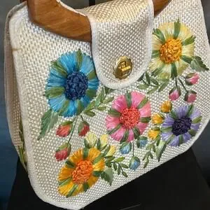 Keywords: straw tote, embroidered bag, wooden handles, vintage style, summer bag, garden party, boho chic, resort wear, handcrafted look, unique accessory, floral embroidery, woven bag