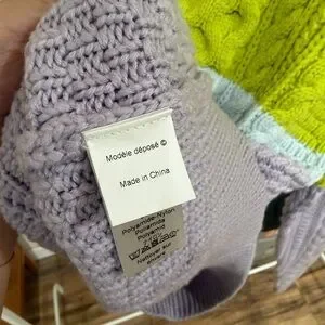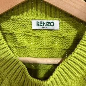 Beautiful KENZO men’s cable-knit pullover sweater, 70% wool 30% polyester, featuring a color-block design in lime green and lavender