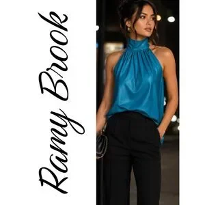 Elevated statement halter top by Ramy Brook in a rich teal blue faux leather with a soft, fluid drape.