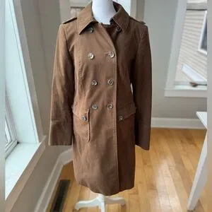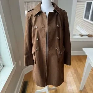Boden brown flannel trench coat overcoat. Double breasted, slightly fitted. Size 6. Measurements in pics. Lined in navy and brown striped flannel. Excellent condition.
