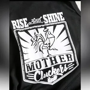 Bold black tank with striking white graphic. Features 'Rise and Shine Mother Cluckers' design.