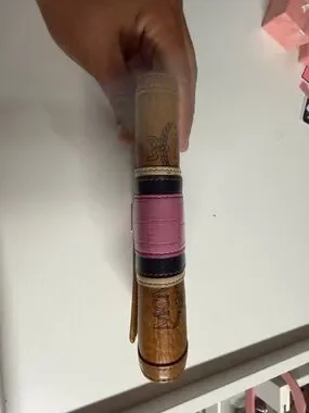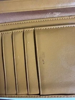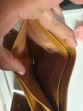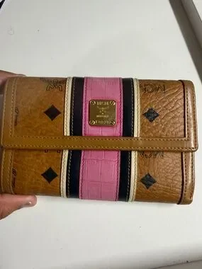 Signature MCM trifold wallet with textured cognac leather. Center pink panel with black and cream striped detailing. Gold-tone logo plaque on front. Snap closure and organized interior layout. Classic designer style for daily use. This item is being sold as-is and may show various signs of use, including but not limited to rubs, discoloration, scuffs, scratches, peeling, stains, tarnish, color transfer, pen marks, coin residue, or general wear and tear.