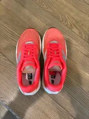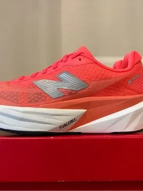 Vibrant coral mesh upper with breathable construction. Responsive FuelCell midsole for energetic cushioning. Silver New Balance logo for a sporty accent. Lightweight design made for daily runs and workouts.