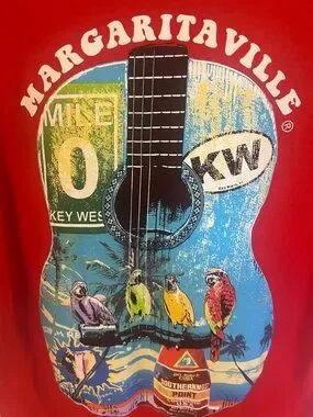 Bright red Margaritaville t-shirt with a large acoustic guitar graphic. Guitar artwork shows colorful parrots and island motifs. Casual, vibrant beachwear look.