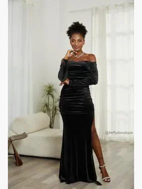 Long Sleeve Velvet Maxi Dress Off Shoulder Formal Evening Gown High Split