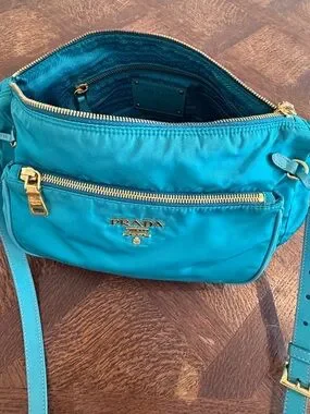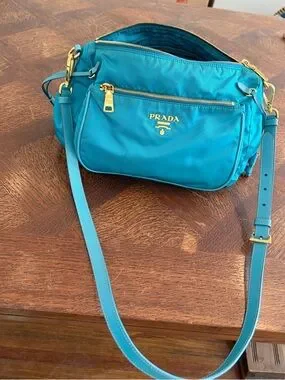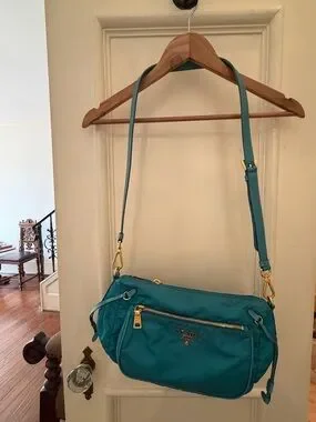 Prada nylon crossbody in vibrant teal. Gold-tone hardware and logo plaque. Front zip pocket and adjustable strap. Lightweight and practical for daily wear.