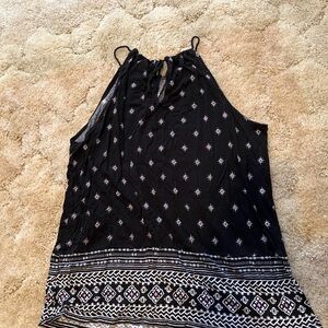 Chic black tank top with white geometric patterns. Perfect for casual outings. Comfortable and stylish.