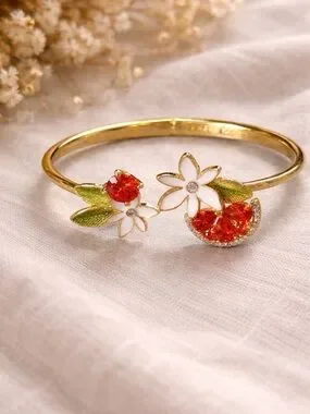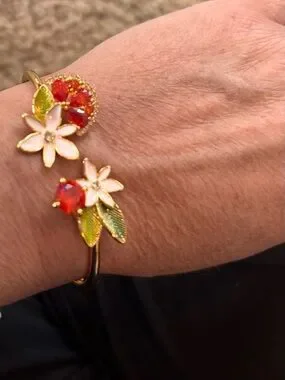 Elegant gold-tone bangle featuring orange crystal accents and enamel white flowers with green leaves. Sparkling orange stones add vibrant color to the floral design. Lightweight and eye-catching for everyday or special occasions.