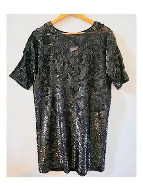 Absolutely stunning and rare French Connection (FCUK) black sequin mesh dress. Fully embellished with intricate sequin detailing throughout, creating a striking, reflective shimmer under any light. Features a sheer illusion neckline with abstract sequin cutout pattern, short sleeves, and body-skimming fit that’s both elegant and bold.