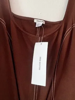 Sleek scoop-neck tank from Urban Outfitters. Rich chocolate brown fabric. Prominent white contrast topstitching. Simple, modern silhouette.