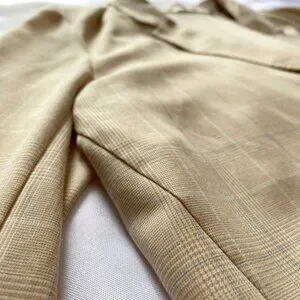 UNIQLO WOMEN'S LIGHT BEIGE WHITE BLUE PLAID SINGLE BREASTED SLOUCHY BLAZER, This is a super lightweight slouchy single breasted notched lapel blazer in a light beige color with blue and white subtile plaid pattern allover - long sleeves with nothing at cuffs- no shoulder pads - relaxed fit- soft shell - unlined - usable welt front pockets, perfect for a business formal spring and summer outfit for work at the office, hipster five - academia in summer!