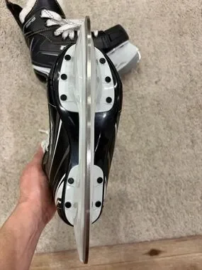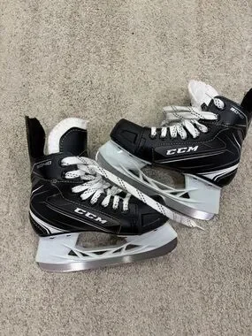 Youth Tacks 9040 ice hockey skates by CCM. Black synthetic boot with white laces. Like new - some sock lint inner sole.
