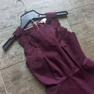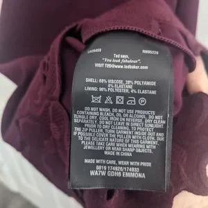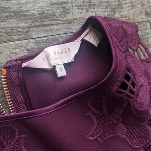 Ted Baker London Emmona burgundy embroidered floral sleeveless skater dress. Features floral embroidery, zipper back closure and has pockets. In excellent condition.