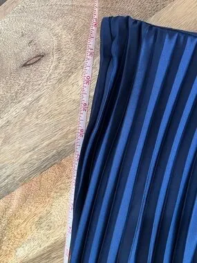 Flowing pleated A-line silhouette. Deep navy hue with crisp sunray pleats. Lightweight drape for smooth movement. Minimal, versatile design for many occasions.