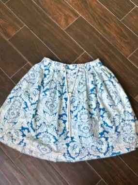 Chic blue and white printed A-line skirt with a flattering gathered waist. Lightweight and breathable fabric for comfortable all-day wear. Versatile design pairs easily with tees or blouses. Feminine pattern adds a polished touch to any outfit.