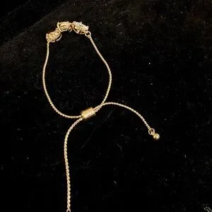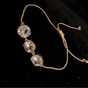 Elegant and eye-catching gold-tone slider bracelet featuring three brilliant round clear stones set in classic prong settings. Designed with an adjustable bolo closure for a perfect fit on any wrist. This piece gives serious diamond-tennis vibes without the diamond price tag—perfect for everyday sparkle or dressy layering.