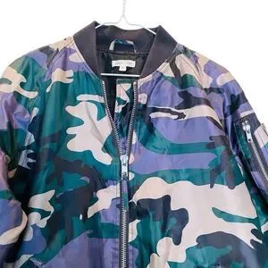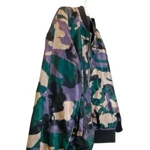 Designed in a multicolor camo print, it features a full front zipper, contrast collar, cuffs, and hem for a bold finish. Details like the zippered sleeve pocket and front hand pockets add both style and function, while long raglan sleeves and a fully lined interior keep it comfortable and easy to wear. A standout layering piece with just the right amount of attitude.