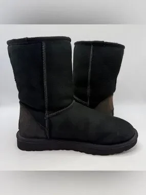 Classic UGG short boots in black, women’s size 7. Made with suede upper and signature sheepskin lining for maximum comfort and warmth.