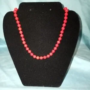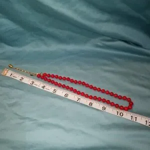 Monet vintage necklace features vibrant red round beads with a subtle marbled or swirl effect, individually knotted for security and a classic drape. The gold-tone hardware includes a textured extender chain finished with a teardrop charm and a secure hook clasp, allowing for adjustable length. This timeless piece offers a bold pop of color, perfect for both casual and formal ensembles.
