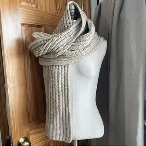 Soft chunky knit scarf from COS. Generous wrap for layered warmth. Neutral light gray color pairs with many outfits. Thick ribbed texture adds cozy structure. Versatile styling as a scarf or shawl.