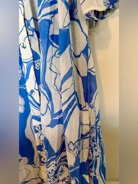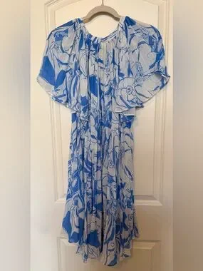 Soft blue and white floral print. Lightweight fabric with a breezy feel. Feminine neckline and does have loops for belt. P2P 17” and L 27”