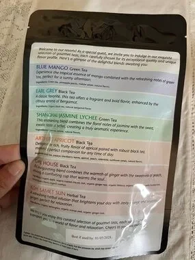 Assorted tea variety pack in black and white pouch. Includes labeled blends such as Blue Mango and Earl Grey. Resealable pouch with colorful flavor labels. Great for sampling multiple teas.