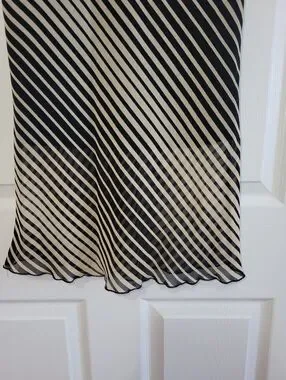 Elegant black and white diagonal stripe skirt with a flattering flow. Lightweight fabric that moves beautifully. Easy to style for day or evening. Black and white colorway offers timeless versatility.