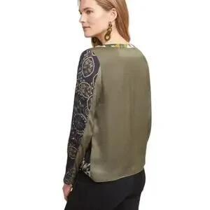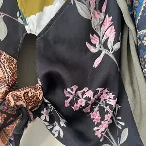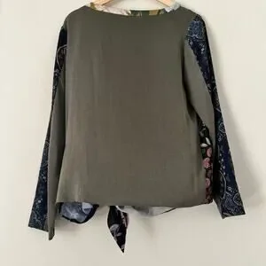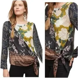 Adorable Anthropologie TINY Patchwork Blooms Tie Waist Blouse Black, cream, white, beige, pink, blue, green, orange, and yellow green floral & paisley print in a patchwork design The back is olive green Ties on the side of the waist Long sleeves Pullover styling 100% poly
