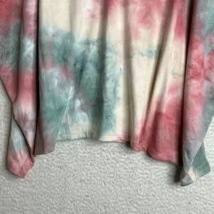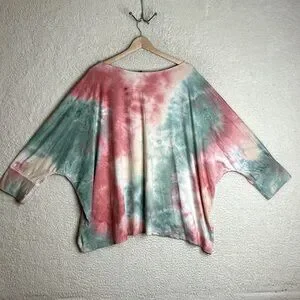 Embrace a vibrant look with this tie-dye V-neck top. Perfect for casual outings, it features a blend of red, blue, and cream hues. Enjoy the relaxed fit and stylish design.