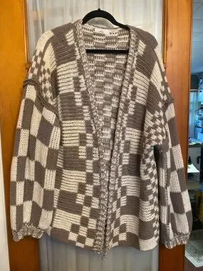 Chunky checkered knit cardigan with an open front. Relaxed, oversized fit and dropped shoulders. Neutral gray and white palette for versatile layering. Soft textured stitch details along the trim. PtP: 27” Length in back 27”