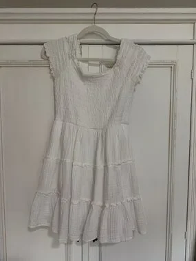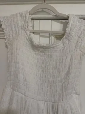 Lightweight white dress with smocked bodice. Flutter cap sleeves and scoop neckline. Tiered skirt with gentle ruffle seams. Easy pull-on styling for casual wear.
